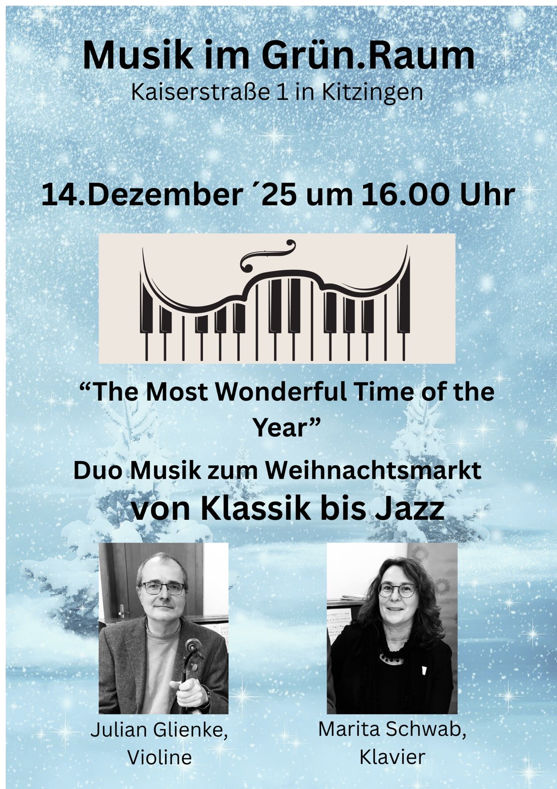Seit es den GRÜN.Raum gibt, ist es Tradition geworden, dass anlässlich des Kitzinger Weihnachtsmarktes ein kleines Konzert von etwa einer halben Stunde mit Weihnachtsmusik von Klassik bis Jazz stattfindet, mit Julian Glienke (Violine) und Marita Schwab (Klavier). Die Musik im GRÜN.Raum findet statt am Sonntag, 14.12. um 16 Uhr – herzliche Einladung dazu. Einen Bummel auf dem Weihnachtsmarkt kann man damit gut verbinden.