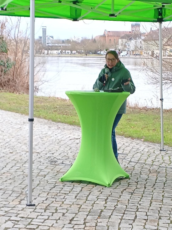 Im Anschluss sprach Jutta Reck, Spitzenkandidatin der GRÜNEN für die Stadtratswahl, über ihre Vision für Kitzingen: eine krisenresiliente, demokratische und barrierefreie Stadt für Alle. Sie setzte weitere Schwerpunkte bei den Themen bezahlbarer Wohnraum für Familien, Singles und ältere Menschen sowie bei der Erarbeitung und Umsetzung von Notfallplänen für Krisensituationen. Ihre Rede beendete sie mit einer Fürsprache für die Gleichstellung von Frauen u.a. in der Politik, in der die kommunalen Räte heute nur zu rund 30% mit Frauen besetzt sind. Gleichberechtigung sei in Deutschland faktisch nicht vorhanden. Deshalb rief sie eindringlich dazu auf, bei der Kommunalwahl Frauen die Stimme zu geben, um der Sichtweise, Erfahrung und Qualifikation von Frauen mehr Gewicht zu geben und für Parität in den Räten zu sorgen.